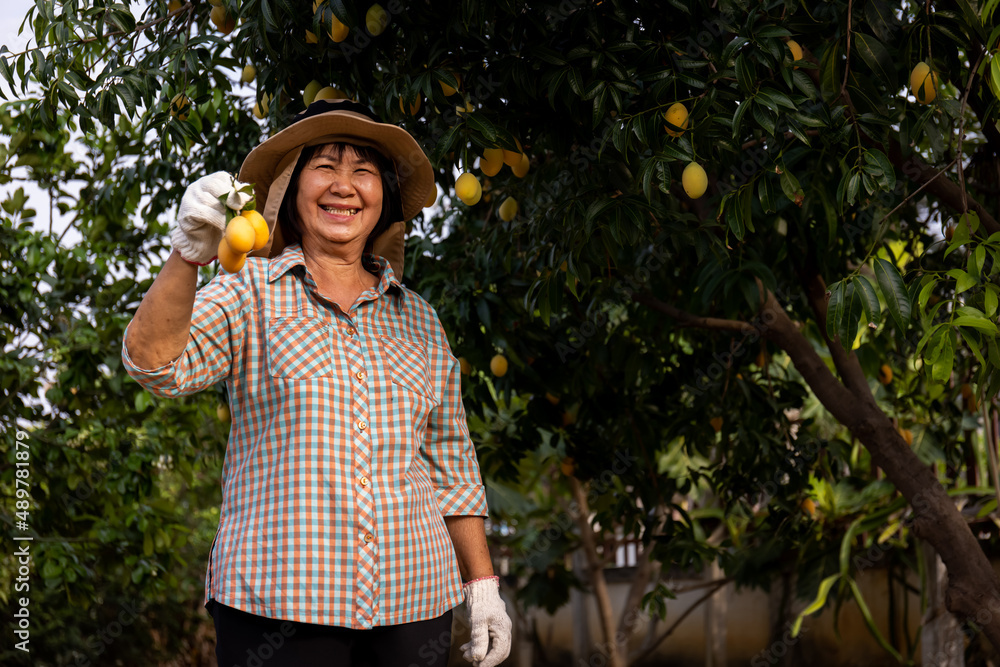 Senior Asian farmer harvesting fresh sweet yellow Marian plums or Gandaria fruit. Maprang or mayong-chit exotic tropical fruits.