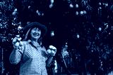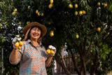 Senior Asian farmer harvesting fresh sweet yellow Marian plums or Gandaria fruit. Maprang or mayong-chit exotic tropical fruits.