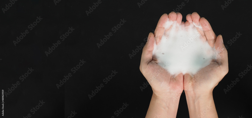 Hands washing gesture with foaming hand soap top view on black background.