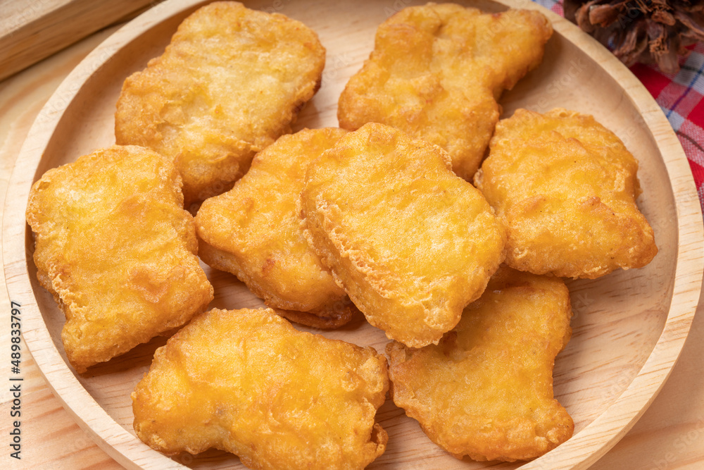 Chicken nuggets in wooden plate on wooden background, Deep fry Chicken nuggets on wooden table.