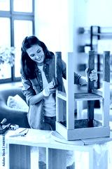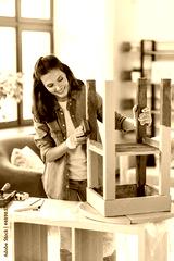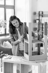 furniture renovation, diy and home improvement concept - happy smiling woman sanding old wooden table with sponge