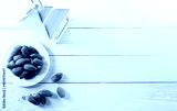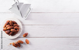 Top view image of Ramadan Kareem decoration, dates fruit, tea and rosary beads on white wooden background.