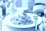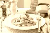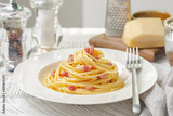 Pasta carbonara in a white plate on a white wooden table. Spaghetti, pancetta and sauce made of egg yolk and parmesan cheese, traditional recipe.