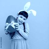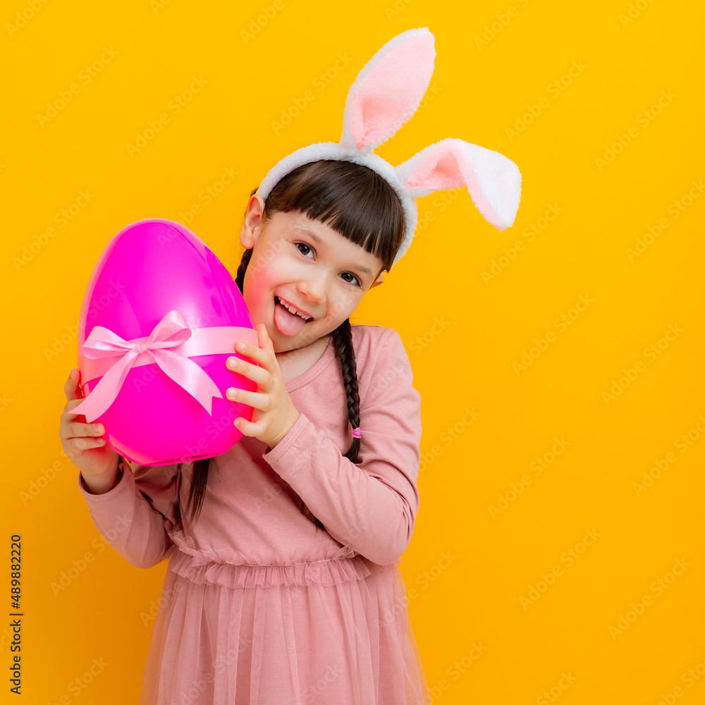 Cute baby little girl with bunny ears holding a big Easter egg on a colored yellow background