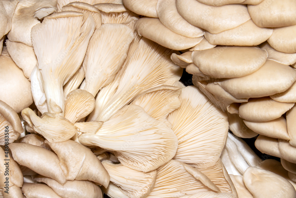 Fresh oyster mushrooms on a white background.Oyster mushrooms grown at home.Oyster mushrooms background.Oyster mushroom is common.