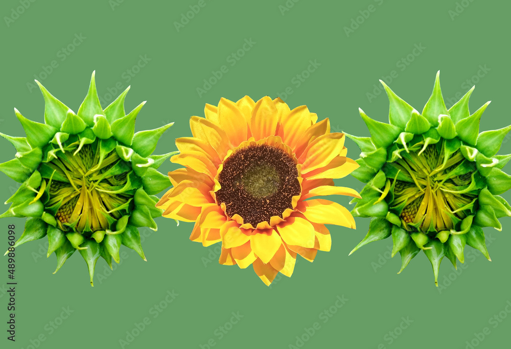 Close up, Single yellow sunflower flower blossom blooming and two young bud isolated on pastel green background for stock photo, house plants, spring floral, nobody