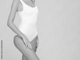 A young, slim and healthy woman in a white swimsuit poses in the studio. Girl with perfect skin. Body care, rejuvenation, sport and diet.