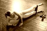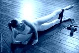 Young and sporty girl in sportswear is using resistance band while doing exercises in home interior. Fit and slender blond woman goes in for sports and fitness.