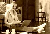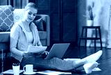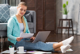 Young woman works with documents using a laptop while sitting on the floor at home. Student, entrepreneur or freelancer girl working or studying remotely via internet.