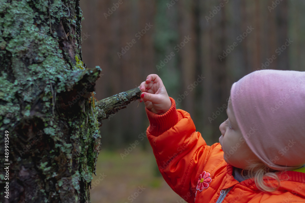 Baby girl caucasian studies nature, examines the bark of a tree. Portrait of a child in an orange jumpsuit and a pink hat