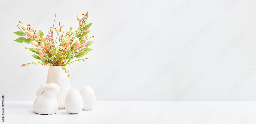 Easter decor in a vase, bunny and eggs on a white table. Easter background with copy space
