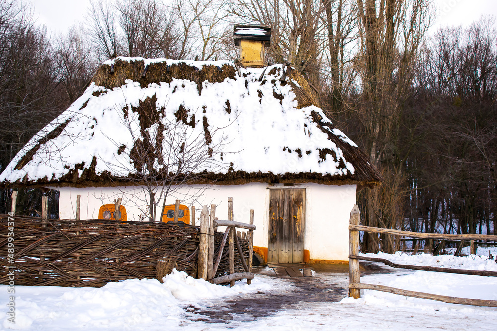 Sustainable and wooden clay ecological comfortable traditional national ethnic slavic cottage house with mud and steep straw thatched roof in rural countryside landscape. ukrainian heritage