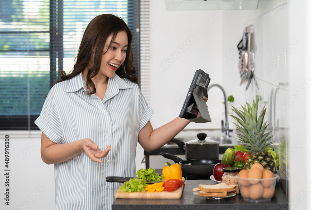cheerful vlogger woman making video call from digital tablet while cooking in the kitchen at home.