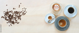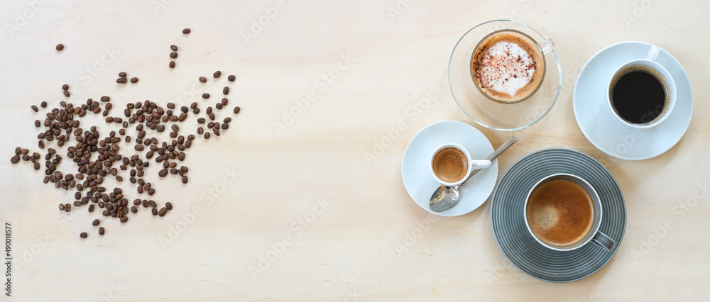 Roasted coffee beans and four cups with various drinks like, espresso, cappuccino, black and with crema on a light wooden table, panoramic format, copy space, top view from above, selected focus