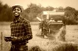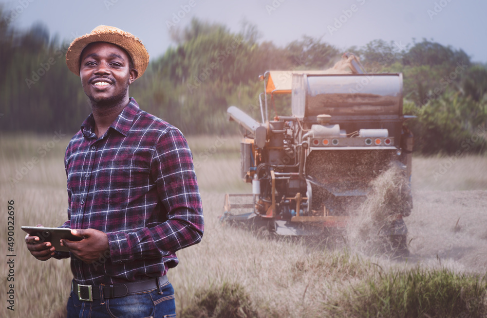 African Farmer holding tablet for combine harvester guidance and control on a background of combine harvester.Smart Farming Agriculture or Cultivation concept