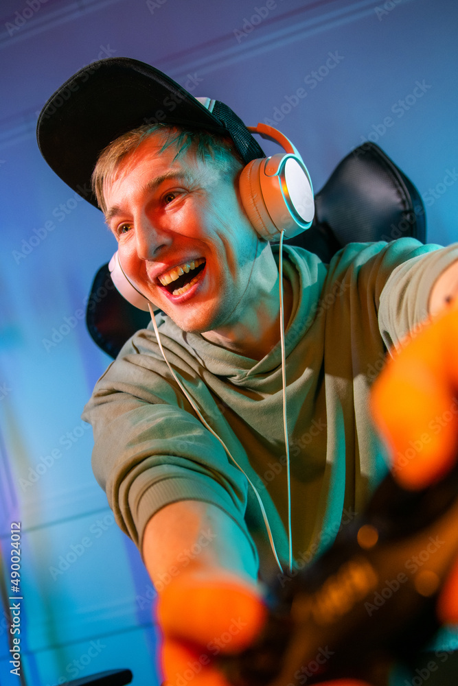 Pro Gamer Man playing computer games. Player using controller for virtual tournament gaming space shooter at home