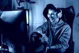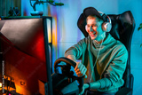 Pro Gamer Man playing computer games. Car Racing Online Video Game