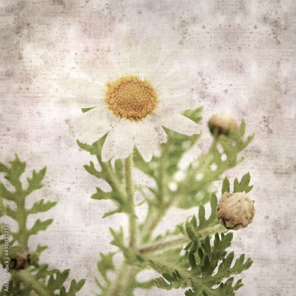 square stylish old textured paper background with magenta flowers of Argyranthemum, marguerite daisy endemic to the Canary Islands