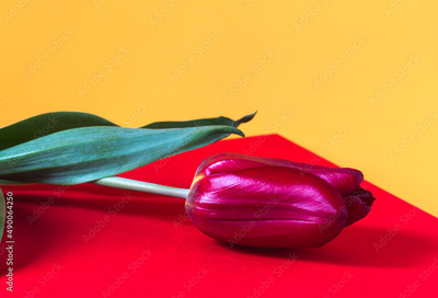 Red tulip on a red-yellow background.Spring background. Holiday card for Valentine's Day, Women's Day, Mother's Day, Easter.
