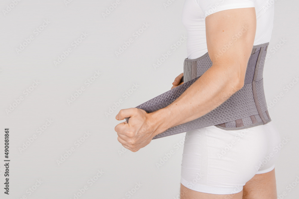 Lumbar brace on the human body isolated on a white background. Trauma of back. Back brace, orthopedic lumbar, support belt for back muscles. Lower back problems health.