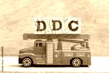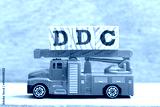 Fire ladder truck hold letter block in word DDC (Abbreviation of Division of disease control, Direct digital control, Display Data Channel or Dewey Decimal Classification) on wood background