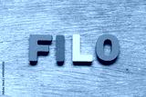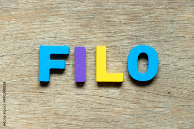 Color alphabet letter in word FILO (abbreviation of first in last out) on wood background