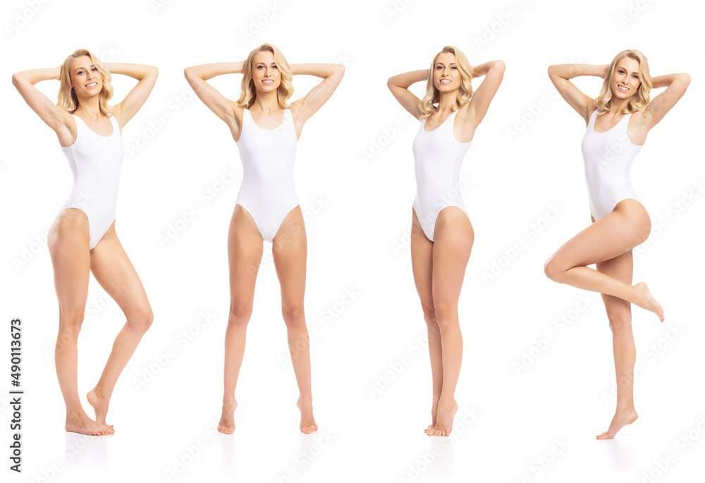 Young, fit and beautiful blond woman in white swimsuit isolated on white background - set collection. Healthcare, diet, sport and fitness concept.