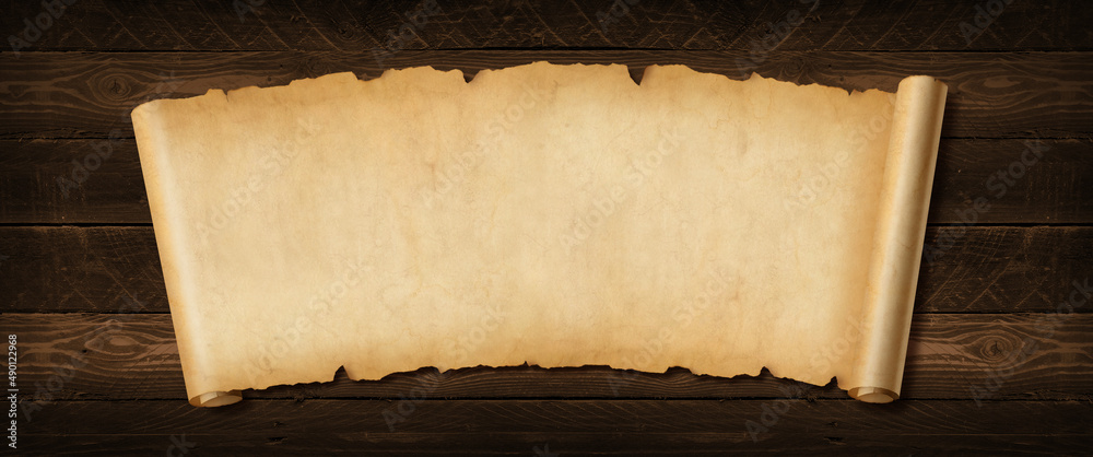 Old paper horizontal banner. Parchment scroll on a wood board
