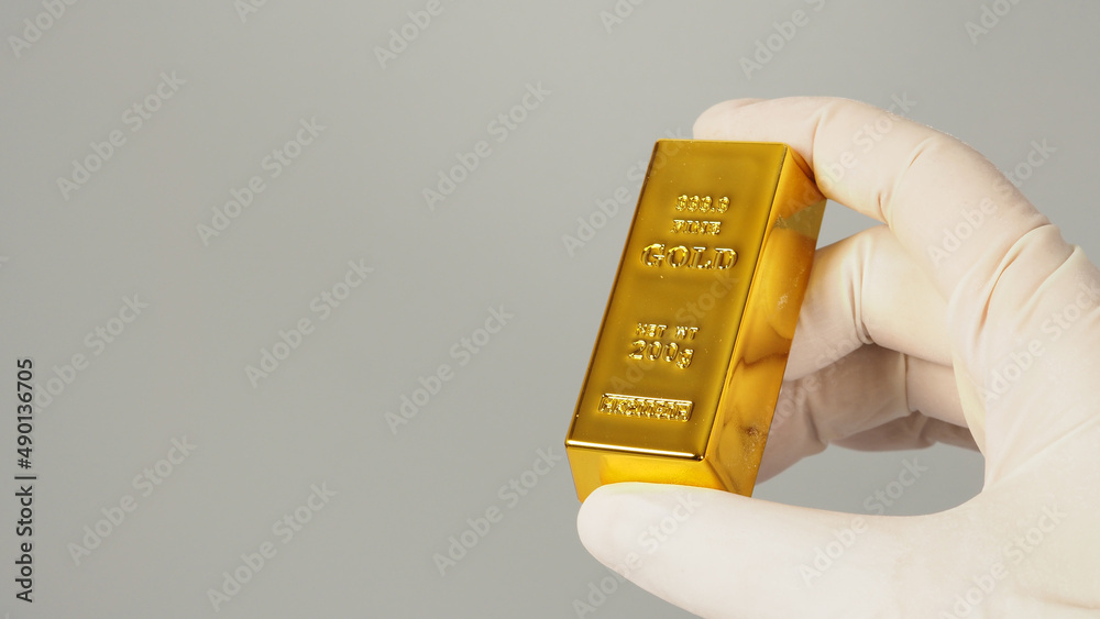 Gold bar in finger hand and wear white latex glove on grey background.