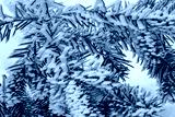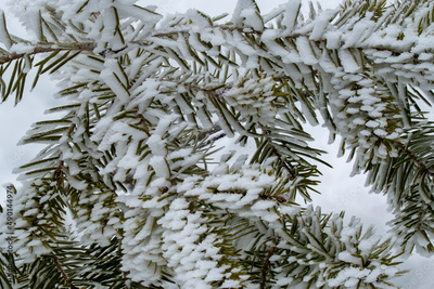 Snowy needles of a coniferous tree in Iller Creek, Spokane Valley, the USA