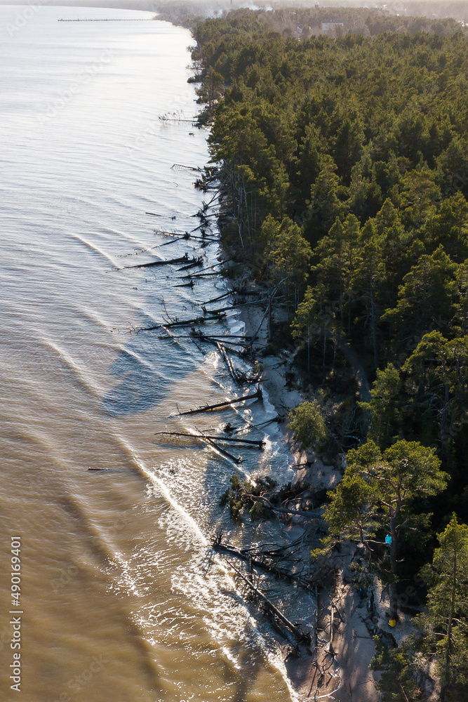 Aerial view of forest, storm broken trees, shadows and Baltic sea, Kolka, Latvia.