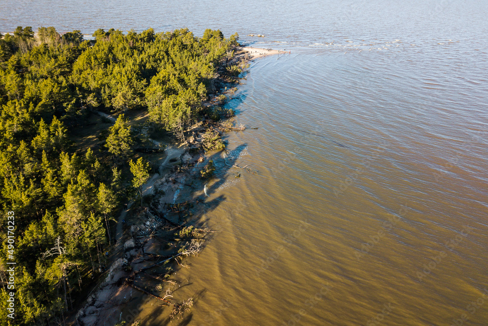 Aerial view of cape Kolka, forest, storm broken trees, shadows and Baltic sea, Kolka, Latvia.