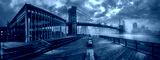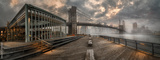 Panoramic view from pier of Manhattan and Brooklyn bridge under the cloudy sky, New York City