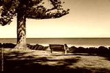 Beautiful shot of a wooden bench on a field in the background of a seascape.