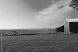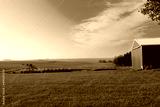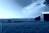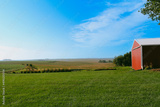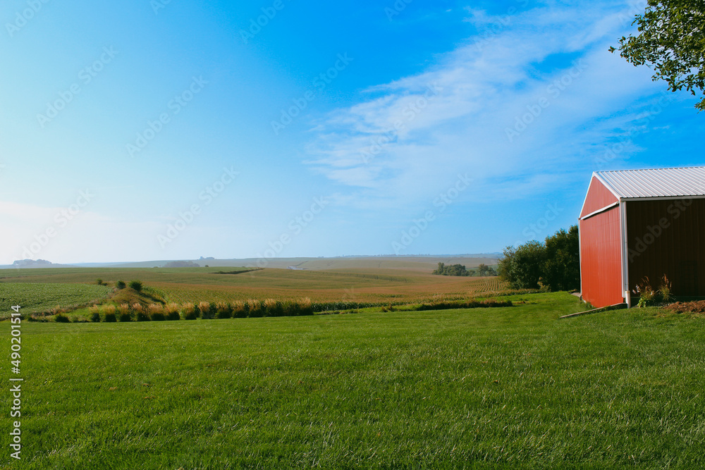 Green farm and a red barn in Iowa under a blue cloudy sky on a sunny day