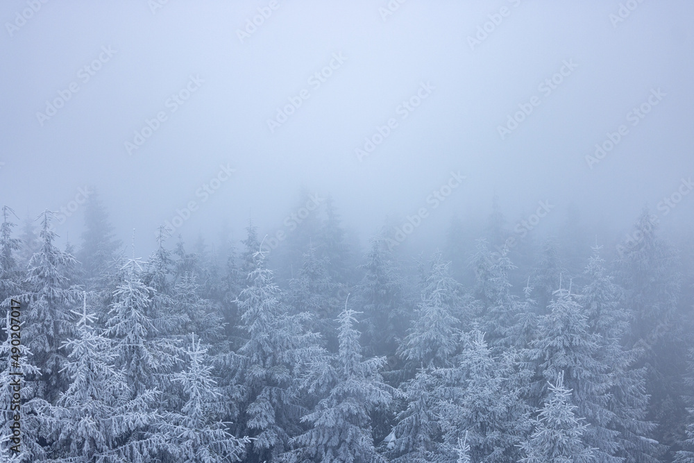 View of the dense forest with firs and pines covered with snow in the cold winter