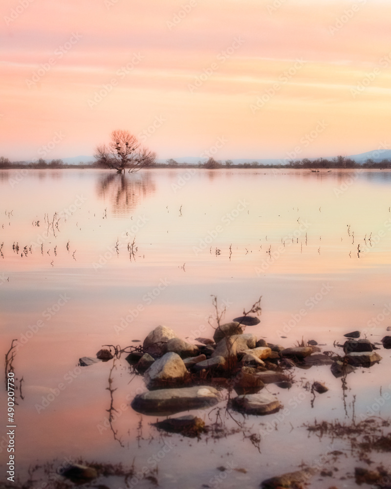 Vertical shot of Lake Kerkini during the sunset in the evening in Greece