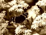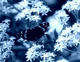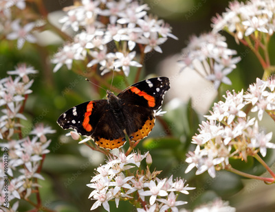 Red Admiral butterfly on white flower. Santa Clara County, California, USA.