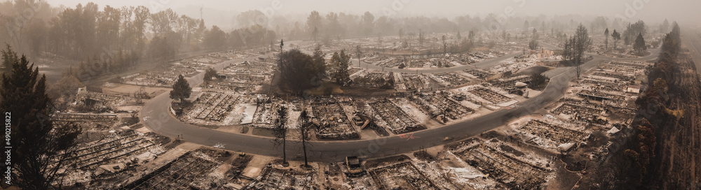 Panoramic view of a mobile home park burnt down after a wildfire blowing through small town usa