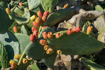 Opuntia prickly pear pads with reddish ripe fruit, found in the Maltese countryside on sunny day.