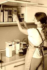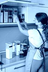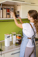 Laughing young female housewife posing during general cleaning, tidying up in cupboard kitchen