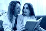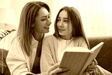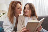 Happy mother and daughter looking at each other while reading book on sofa