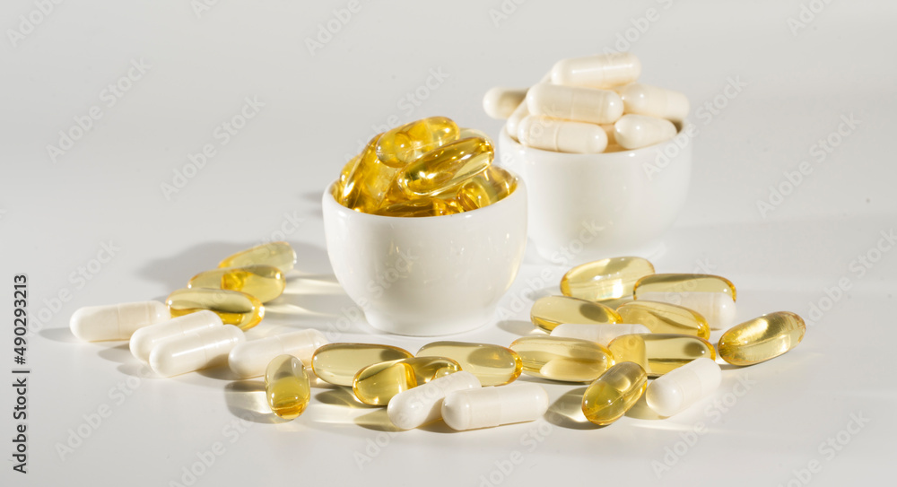 Food supplement oil filled fish oil, omega 3, omega 6, omega 9, vitamin A, vitamin D, vitamin E, flaxseed oil.