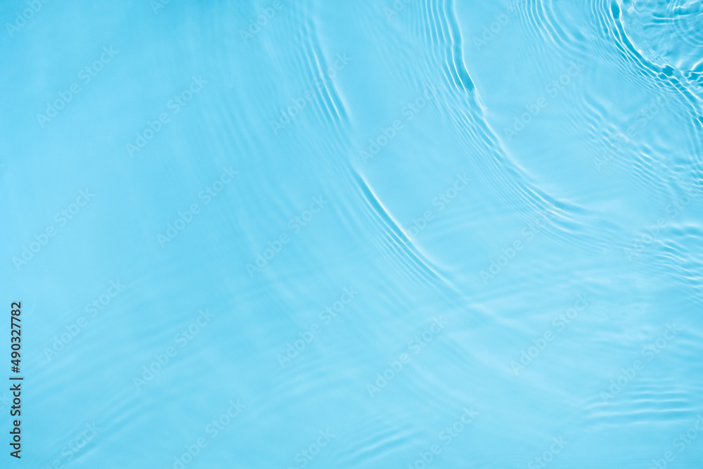 Transparent blue colored clear water surface texture with ripples, splashes and bubbles. Abstract nature background Water waves in sunlight with copy space Cosmetic moisturizer micellar toner emulsion