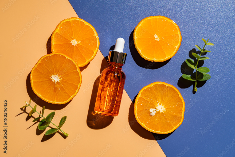 Citrus fruit vitamin c serum oil beauty care, anti aging natural cosmetic with fresh orange fruits on blue background, top view