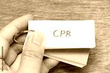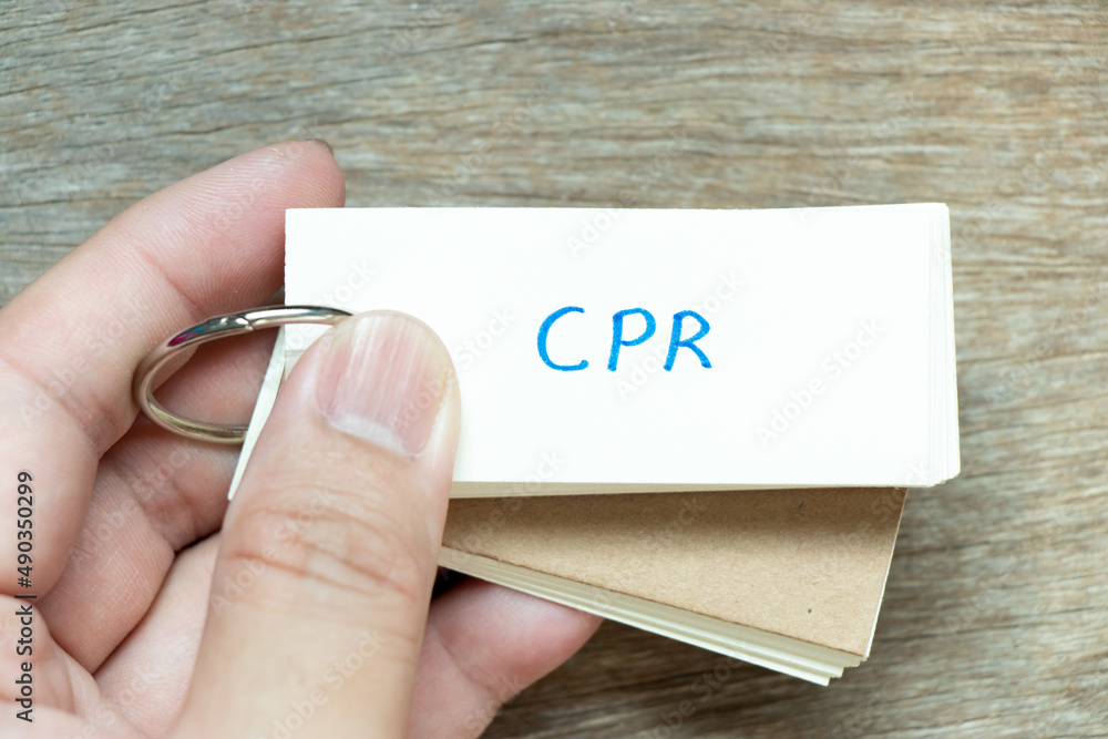 Man hold the flash card with handwriting word CPR (abbreviation of Cardiopulmonary resuscitation) on wood background