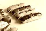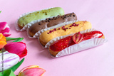 Eclairs and colorful tulips flower composition over pink background . Love, Mother's day, Women's day and spring time flower background. spring nature background