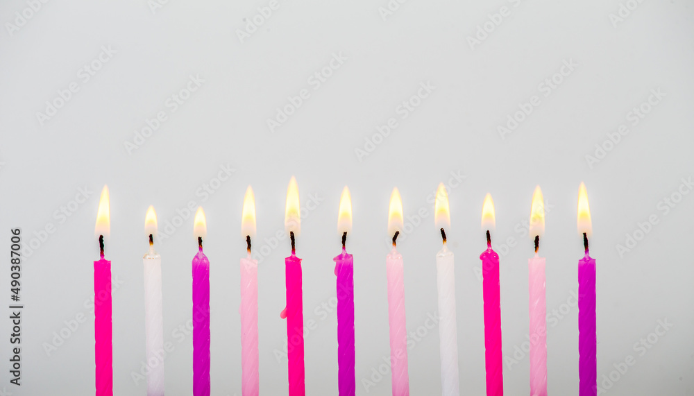 Various pink color birthday cake candles burning in line on gray background, studio shot, lot of copy space for greetings. Side view.