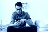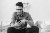 Upset man shocked watching news in smartphone while sitting on sofa at home.