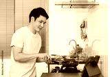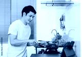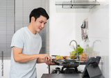 man cooking and preparing food according to a recipe on a tablet computer in the kitchen at home